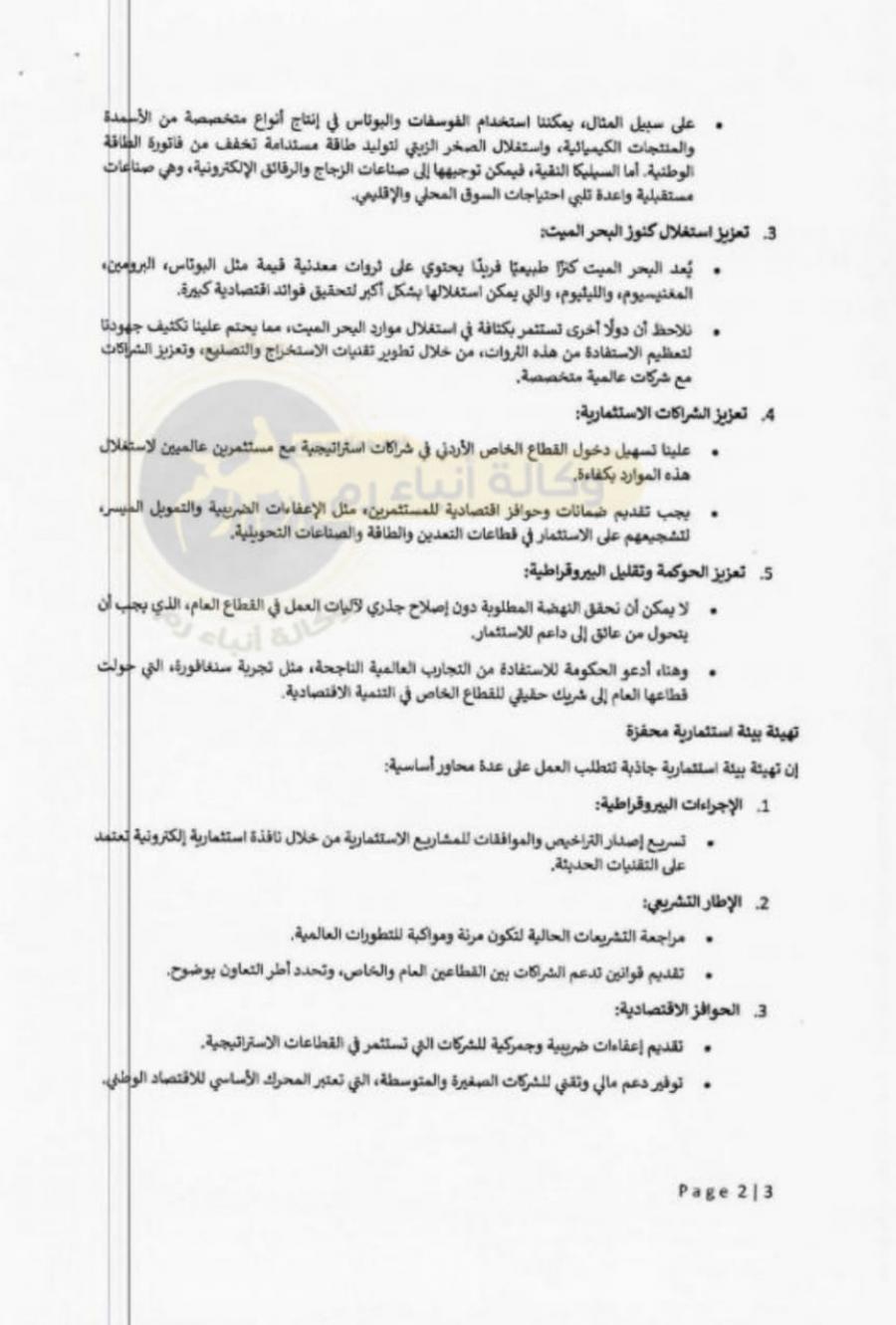 حيث دعا ارشيدات في خطابه ، إلى تبني رؤية اقتصادية شاملة تقوم على تعزيز الشراكة الحقيقية بين القطاعين العام والخاص، والاستغلال الأمثل للثروات الطبيعية باعتبارها مدخلًا أساسيًا لتحقيق نهضة اقتصادية مستدامة في الأردن.