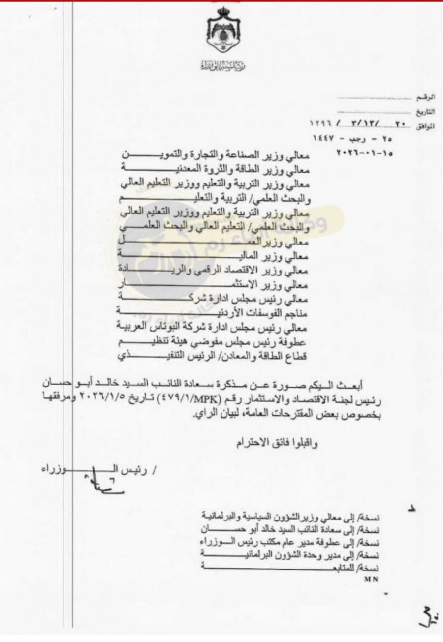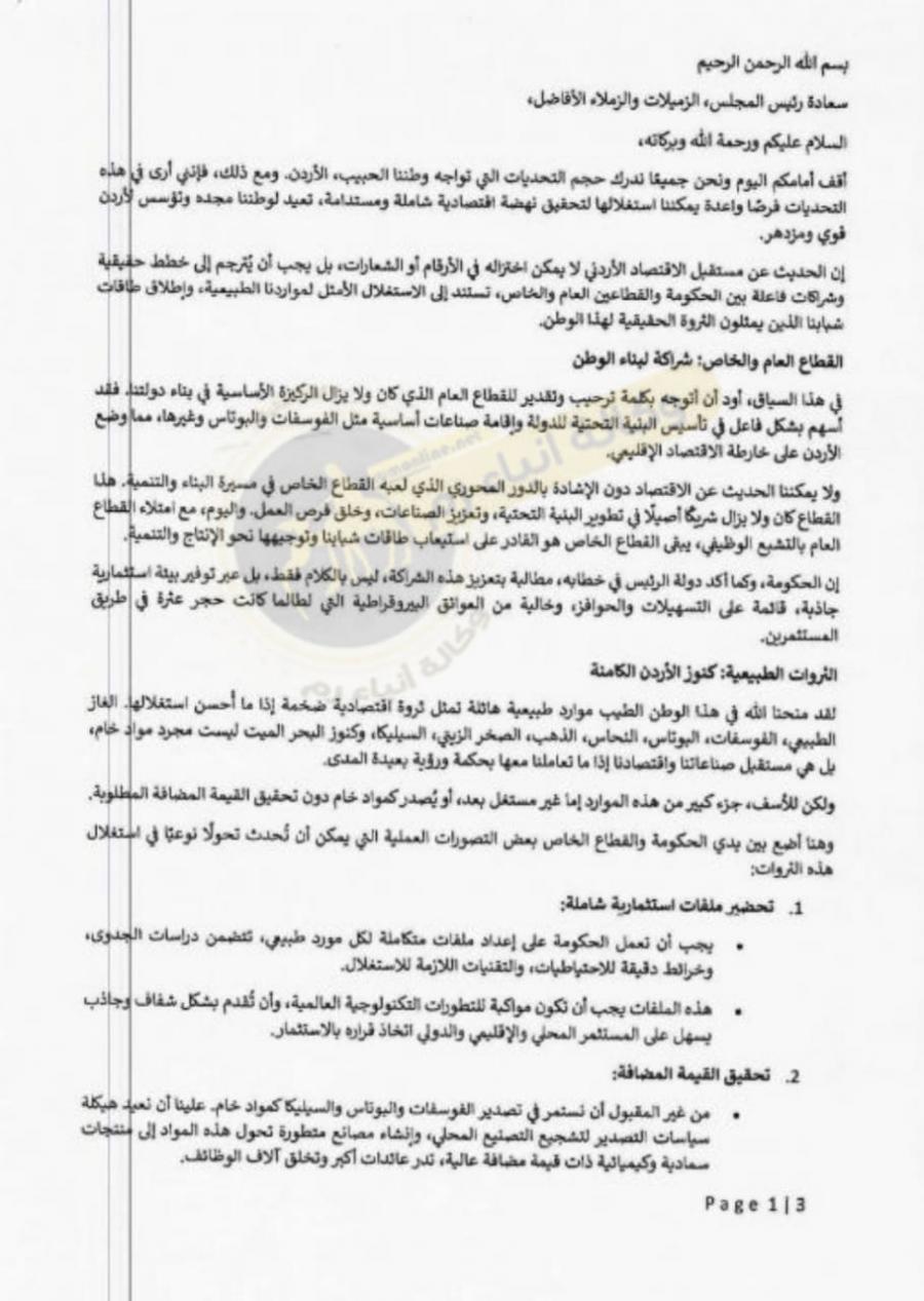 وختم بالتأكيد على أن المرحلة الحالية تمثل فرصة تاريخية لإعادة بناء الاقتصاد الأردني على أسس مستدامة، تتطلب تعاونًا جادًا بين الحكومة ومجلس النواب والقطاع الخاص.