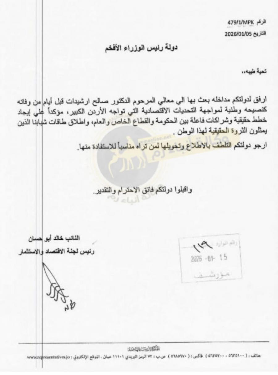 كشف رئيس لجنة الاقتصاد والاستثمار النيابية النائب خالد أبو حسان عن مداخلة بعث بها اليه معالي المرحوم العين الدكتور صالح ارشيدات قبل أيام من وفاته، حيث قدمها كنصيحة وطنية لمواجهة التحديات الاقتصادية التي تمر بنا المملكة.