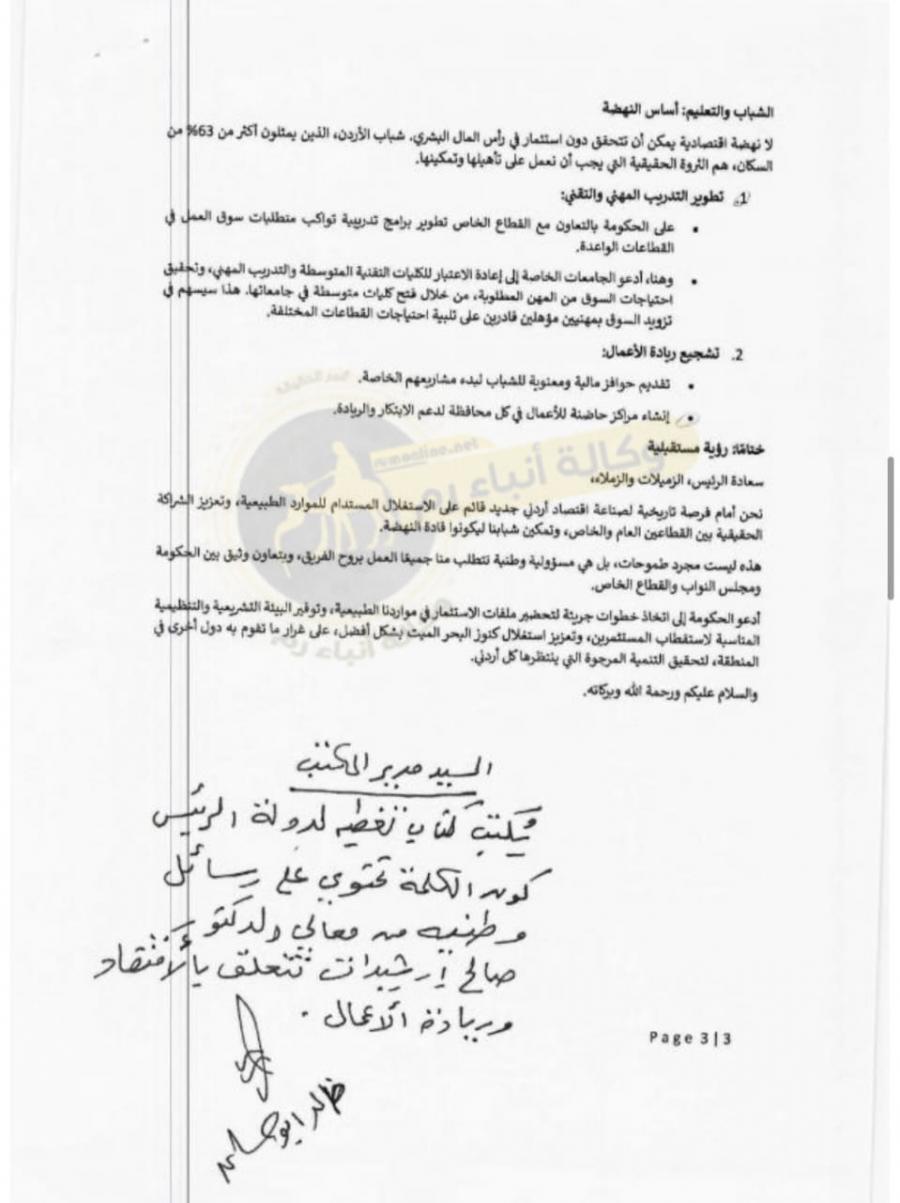 ولفت إلى دور الشباب، قائلًا "لا نهضة اقتصادية يمكن أن تتحقق دون استثمار في رأس المال البشري، شباب الأردن، الذين يمثلون أكثر من 63% من السكان، هم الثروة الحقيقية التي يجب أن تعمل على تأهيلها وتمكينها".