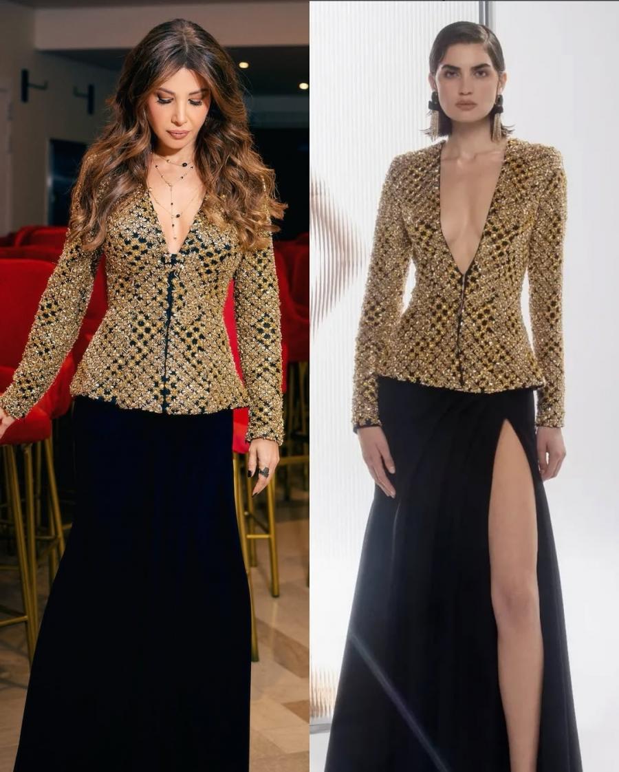 ولفتت النجمة اللبنانية الأنظار بإطلالتها الناعمة التي اختارتها من تصميم المصمم اللبناني نجا سعادة، وتميّز بتفاصيله المميزة وبالتطريزات اللامعة باللون الذهبي من الجهة العلوي للفستان، وحرصت على اجراء بعض التعديلات البسيطة على التصميم الأصلي لتبدو أكثر احتشاماً، حيث قامت بتصير الفتحة الأمامية عند منطقة الصدر. وينسدل الثوب من الأسفل بتنورة سوداء طويلة بتصميم ناعم ومنسدل، مع فتحة جانبية عالية عند الفخذ، لتبدو إطلالتها أكثر رقي وأناقة.