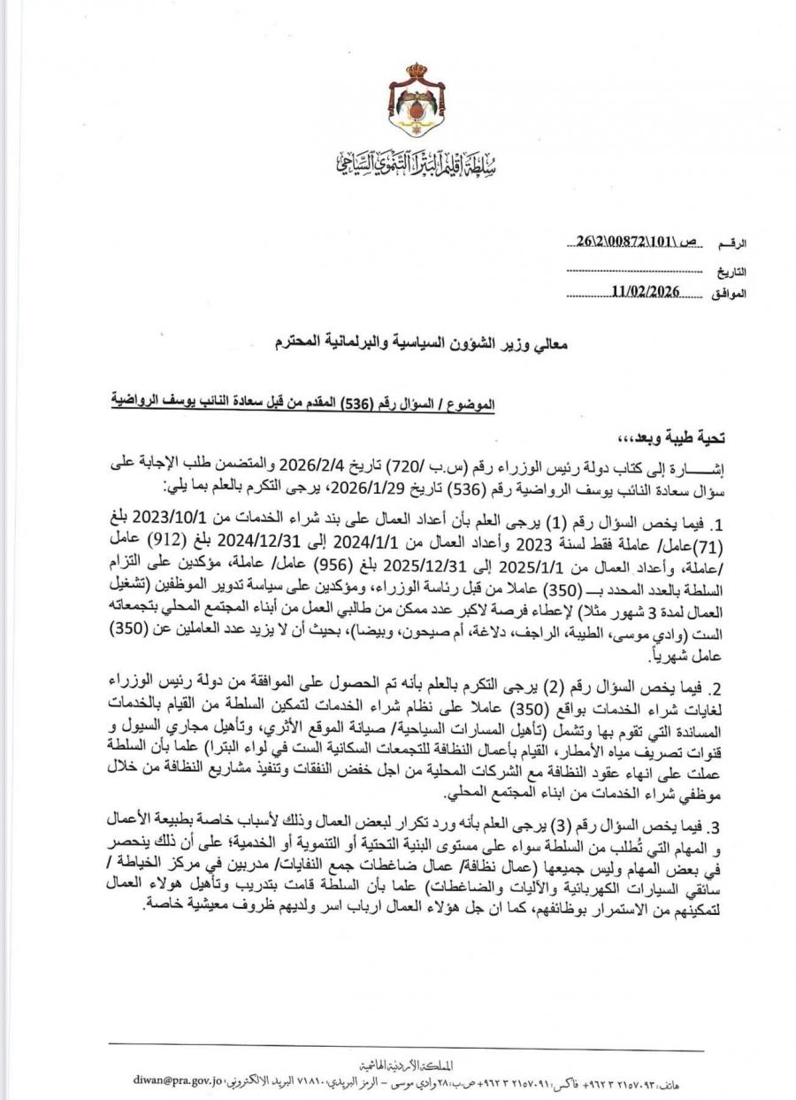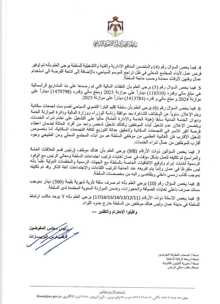واضاف إن علامات الاستفهام تبدأ من "سقف الرواتب"، حيث نطالب رئاسة السلطة ببيان السند القانوني الصريح الذي سمح برفع الدخل الشهري لرئيسها إلى (٦٥٠٠) دينار حيث هذا الرقم لا يبدو مستفزاً للمواطن فحسب، بل يبدو متجاوزاً للأنظمة المالية الموحدة للمؤسسات المستقلة وسقوف الرواتب التي أقرتها الدولة، متسائلا هل أصبحت سلطة البترا استثناءً فوق الأنظمة والقوانين التي تحكم بقية مؤسسات الدولة؟