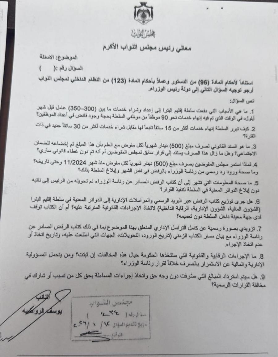 يذكر ان النائب يوسف الرواضية انضم لعدد من النواب الذين قدموا اسئلة حول ملفات تتعلق بسلطة إقليم البترا حيث قام النائب وليد المصري بتحويل سؤاله إلى استجواب وكذلك تقدم النواب احمد هميسات ورانيا خليفات باسئلة نيابية حول سلطة الإقليم