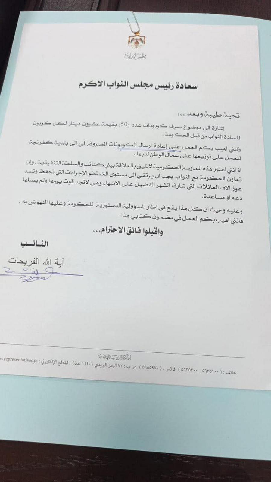 وأشار إلى أنه وفي شهر رمضان الماضي رفض استلام الكوبونات وذلك لأسباب قام بشرحها بموجب كتاب أرسله في حينه إلى رئيس مجلس النواب..